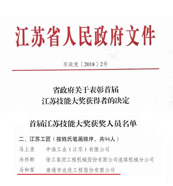 為深入實(shí)施科教與人才強(qiáng)省戰(zhàn)略,大力弘揚(yáng)工匠精神,江蘇省人民政府日前發(fā)文“省政府關(guān)于表彰江蘇技能大獎(jiǎng)獲得者的決定”,表彰作出突出貢獻(xiàn)的優(yōu)秀技能人才,集團(tuán)董事長馬和軍當(dāng)選為“江蘇工匠”,這是馬董的榮耀,更是達(dá)欣的光彩!
