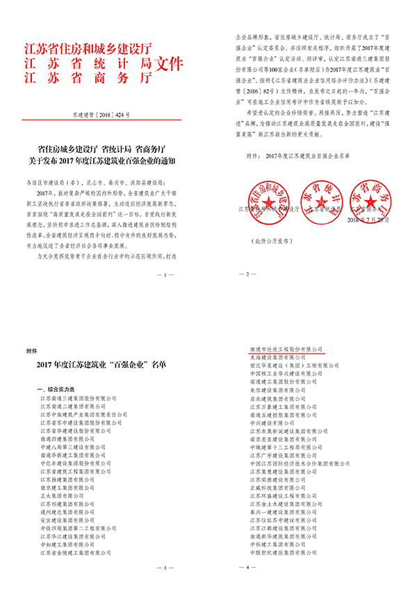 江蘇建筑業(yè)“百強企業(yè)”是由省建設廳、省統(tǒng)計局、省商務廳成立的“百強企業(yè)”認定委員會評議認定,從企業(yè)營業(yè)額等經(jīng)濟類指標、質(zhì)量安全、技術創(chuàng)新指標等方面進行綜合評定,旨在充分發(fā)揮優(yōu)勢企業(yè)在全行業(yè)中的引領和示范作用,打造建筑企業(yè)品牌,提升核心競爭力,是權威性的政府評選。同時按照《江蘇省建筑業(yè)企業(yè)信用綜合評價辦法》(蘇建建管〔2016〕82號)文件精神,自發(fā)布之日起的一年內(nèi),“百強企業(yè)”可在施工企業(yè)信用考評中作為省級獎勵予以加分。